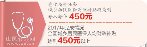 2017年,全國(guó)城鄉(xiāng)居民醫(yī)保人均財(cái)政補(bǔ)助標(biāo)準(zhǔn)在2016年的基礎(chǔ)上再獲提升,達(dá)到平均每人每年450元。隨著醫(yī)保制度不斷健全,政府投入逐年增加,醫(yī)保保障水平穩(wěn)步提高,保障范圍明顯擴(kuò)大。在提高居民醫(yī);I資標(biāo)準(zhǔn)、按規(guī)定落實(shí)困難人群個(gè)人繳費(fèi)補(bǔ)助的基礎(chǔ)上,我國(guó)還合理確定大病保險(xiǎn)籌資標(biāo)準(zhǔn),增強(qiáng)大病保險(xiǎn)保障能力,并加大大病保險(xiǎn)向困難人員傾斜政策力度,通過(guò)降低起付線、提高報(bào)銷比例等實(shí)施精準(zhǔn)支付政策,貧困人口受益水平得到切實(shí)提高。
