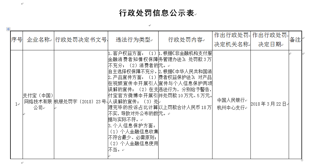 人民網(wǎng)北京4月9日電 據(jù)中國人民銀行網(wǎng)站杭州中心支行消息,昨日,中國人民銀行杭州中心支行根據(jù)《非金融機構(gòu)支付服務管理辦法》,對支付寶(中國)網(wǎng)絡技術(shù)有限公司處罰款3萬元;根據(jù)《中華人民共和國消費者權(quán)益保護法》,對支付寶(中國)網(wǎng)絡技術(shù)有限公司產(chǎn)品宣傳與個人信息保護兩項違法行為,分別給予警告,并處罰款10萬元、5萬元。罰款合計18萬元。