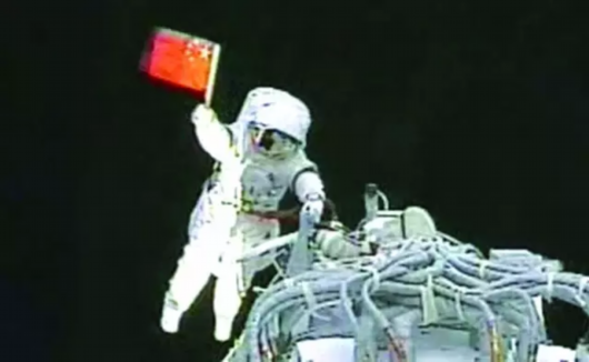 △航天員翟志剛圓滿完成我國首次空間出艙活動,揮舞國旗。
