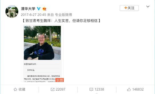 首先恭喜你即將來到清華大學(xué),繼續(xù)你的學(xué)習(xí)和生活。我們看到了你寫給清華大學(xué)的文章《一位甘肅高分考生的請求》,相信你早已具備了清華人自強(qiáng)不息、厚德載物的品質(zhì),我們代表清華園歡迎來自甘肅定西的你!