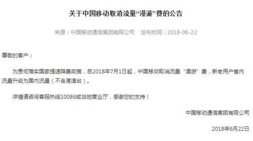 中國移動22日在官網(wǎng)發(fā)布關于取消流量“漫游”費的公告,公告稱,自2018年7月1日起,中國移動取消流量“漫游”費,新老用戶省內(nèi)流量升級為國內(nèi)流量(不含港澳臺)。