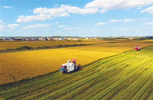 10月18日,在江蘇省鹽城市大豐區(qū)新豐鎮(zhèn)老墩村,收割機(jī)在稻田里收獲水稻(無(wú)人機(jī)拍攝)。 (新華社發(fā))