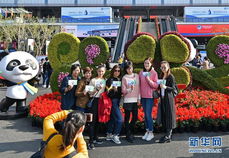 參觀者在中國(guó)國(guó)際進(jìn)口博覽會(huì)場(chǎng)館前合影(11月10日攝)。在上海舉行的首屆中國(guó)國(guó)際進(jìn)口博覽會(huì)于11月10日閉幕。新華社記者 李鑫 攝