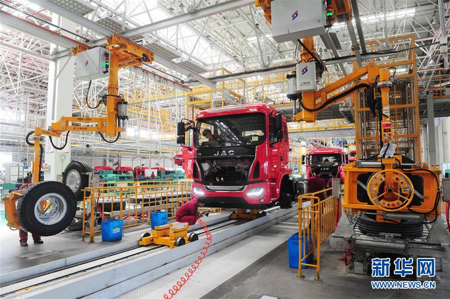 技術(shù)工人在安徽江淮汽車集團(tuán)股份有限公司阜陽分公司江淮汽車總裝車間生產(chǎn)線上組裝卡車(7月12日攝)。新華社發(fā)(王彪 攝)