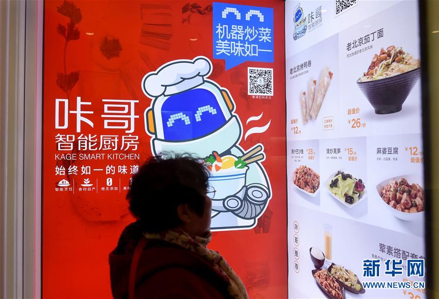 一名顧客在北京東單北大街“咔哥”智能廚房觀看推出的菜品。這家餐廳沒有廚師,而是用機(jī)器人炒菜,引來很多顧客嘗鮮(11月7日攝)。新華社記者 羅曉光 攝