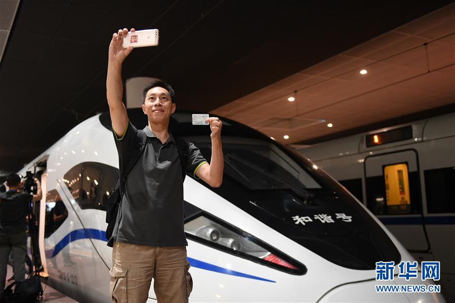 搭乘G5711次高鐵列車前往香港西九龍站的乘客在深圳北站拍照留念(9月23日攝)。9月23日,廣深港高鐵全線開通。新華社記者毛思倩攝