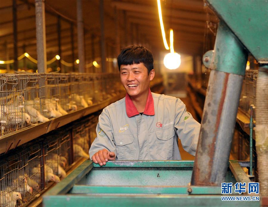 河北省海興縣張會(huì)亭鄉(xiāng)徐西北村建檔立卡貧困戶徐寶龍?jiān)谡畮椭龀纸ㄆ鸬酿B(yǎng)雞場(chǎng)里工作(12月11日攝)。新華社記者 牟宇 攝