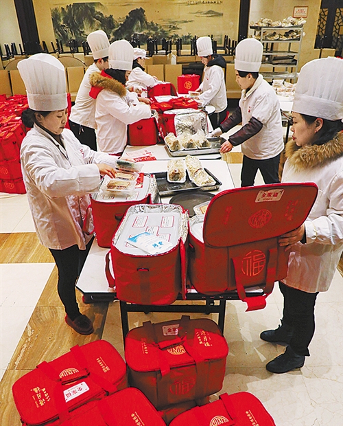 2月3日,蘇州一家老字號(hào)餐館服務(wù)員為“打包年夜飯”套餐配菜。杭興微攝(新華社發(fā))