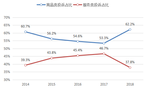 一是商品投訴比重?cái)U(kuò)大。2018年,全國(guó)市場(chǎng)監(jiān)管部門(mén)共受理商品投訴231.81萬(wàn)件,占比62.2%,同比增長(zhǎng)61.3%,服務(wù)投訴140.75萬(wàn)件,占比37.8%,同比增長(zhǎng)12.1%。商品投訴主要集中在日用百貨、食品、家用電器、交通工具、通訊器材等領(lǐng)域。服務(wù)投訴主要集中在遠(yuǎn)程購(gòu)物、居民服務(wù)、互聯(lián)網(wǎng)服務(wù)、文化娛樂(lè)服務(wù)、修理維護(hù)服務(wù)等領(lǐng)域。