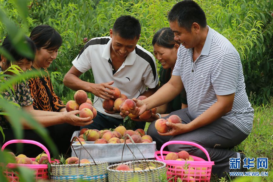 2019年7月18日,河南省光山縣馬畈鎮(zhèn)太平村瑞全家庭農(nóng)場(chǎng),村民們?cè)谔覉@內(nèi)收獲黃金蜜黃桃。