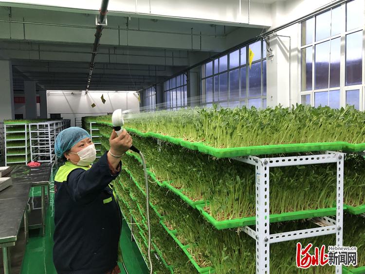 52歲的燕明慧身著藍綠相間的工作服、頭戴防塵帽,嫻熟地穿梭在一人多高的置物架間,舉著噴壺給一排排芽苗噴水。細流所到處,水珠滾動,一盤盤綠油油的小麥苗、蕎麥苗、豌豆苗煞是喜人。