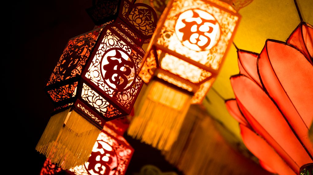 掛上大紅燈籠,貼上對聯(lián)和“福”