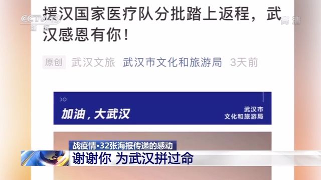 這組題目為“謝謝你,為武漢拼過命”的海報,是在3月17日首批醫(yī)療隊員啟程離漢的日子發(fā)布的,到3月20日中午,這條公眾號文章已經(jīng)獲得了75萬閱讀量。