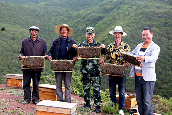 布哈和村民展示養(yǎng)蜂成果。