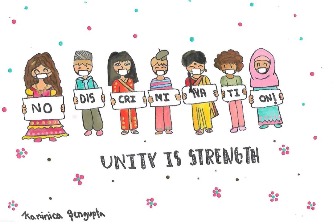 兒基會圖片丨來自印度的12歲女孩卡尼妮卡繪制的畫作,呼吁杜絕歧視,團結(jié)抗疫