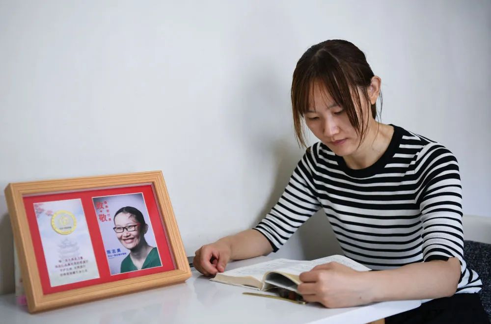 陳志昊在家中翻看碩士論文參考資料,旁邊放著她在武漢戰(zhàn)疫一線的留影(5月10日攝)。新華社記者 鄧華 攝
