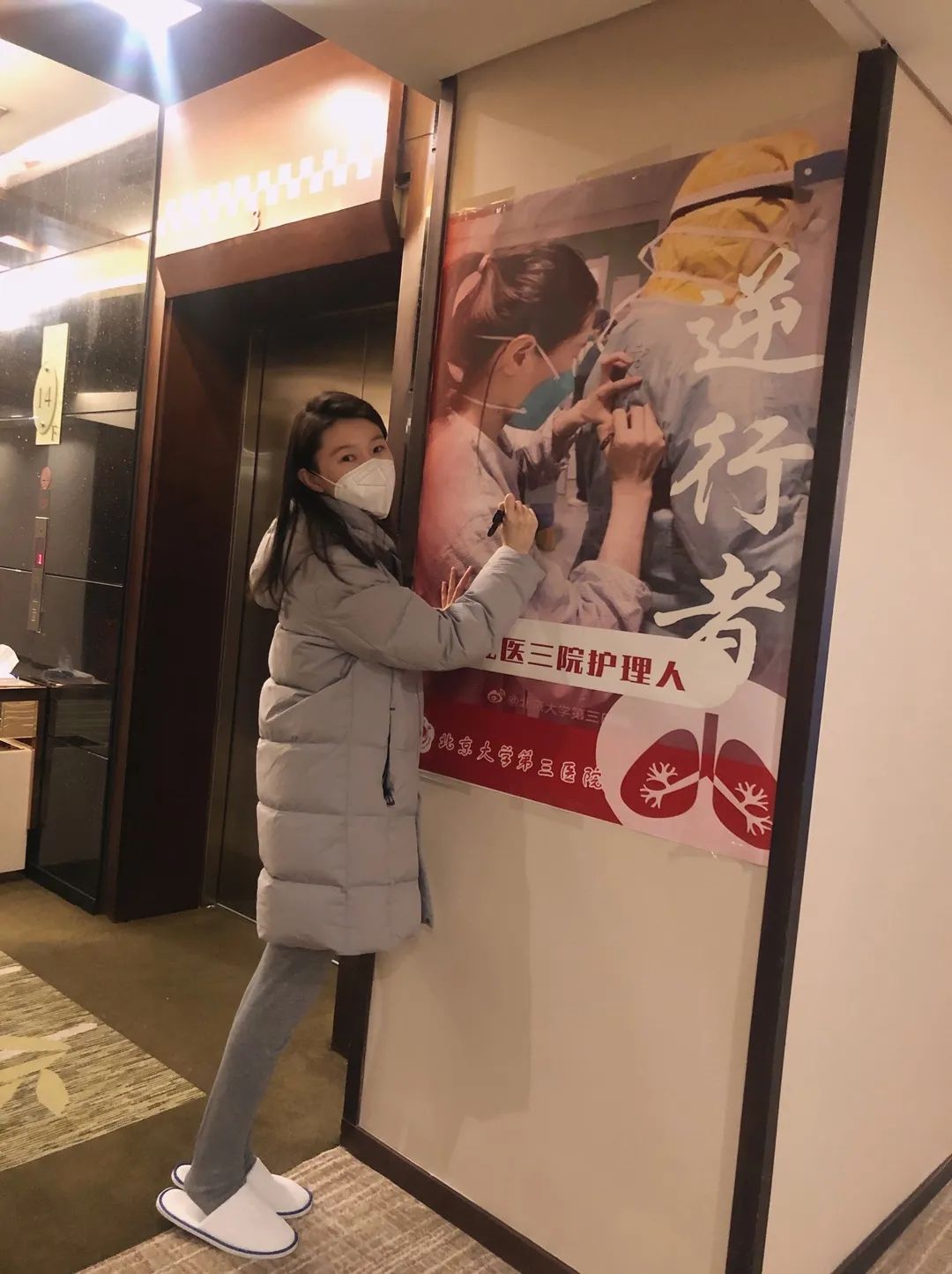北京大學(xué)第三醫(yī)院危重醫(yī)學(xué)科護(hù)士張佳男在武漢駐地與張貼的海報(bào)合影(2月16日攝)。海報(bào)照片拍攝于1月29日凌晨三點(diǎn),張佳男和隊(duì)員們進(jìn)入華中科技大學(xué)同濟(jì)醫(yī)院中法新城院區(qū)隔離病房第一晚,當(dāng)時(shí)張佳男正在給隊(duì)友的防護(hù)服上寫(xiě)字。新華社發(fā)