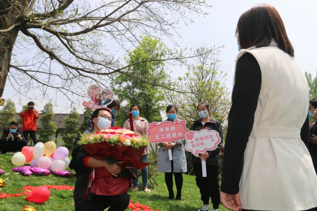 成都醫(yī)學(xué)院第一附屬醫(yī)院重癥醫(yī)學(xué)科男護(hù)士、四川省第三批援湖北醫(yī)療隊(duì)隊(duì)員王旭濤(右)返回四川隔離期滿后第一時(shí)間向護(hù)士女友肖雪梅求婚(4月14日攝)。新華社發(fā)