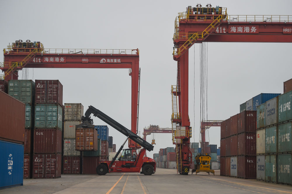 工作人員在位于海南洋浦的洋浦港小鏟灘碼頭轉(zhuǎn)運集裝箱(4月8日攝)。新華社記者 蒲曉旭 攝