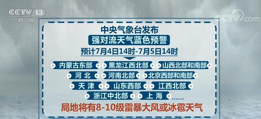 另一個是“強對流天氣藍色預警”。中央氣象臺今天10時發(fā)布強對流天氣藍色預警,預計今天下午2時至明天下午2時,內(nèi)蒙古東部、黑龍江西北部、山西北部和南部、河北、河南北部、北京西部和南部、天津、山東西部、江西北部、浙江中北部、上海等地局地將有8—10級雷暴大風或冰雹天氣。