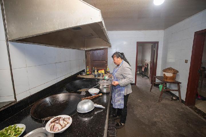 ↑在重慶市南川區(qū)山王坪鎮(zhèn)廟壩村,村民鄭洪琴在自家經(jīng)營的農(nóng)家樂內(nèi)為游客做飯(9月28日攝)。
