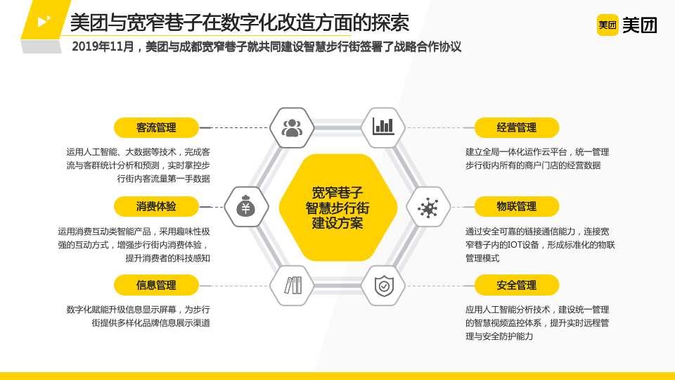 美團(tuán)與寬窄巷子合作改變了運營管理團(tuán)隊在精準(zhǔn)掌握步行街客流、交易用戶及經(jīng)營管理等方面較為傳統(tǒng)的局面,為寬窄巷子提供了“全場景引流+新消費體驗+智慧化管理”三位一體的數(shù)字化解決方案:在線下,通過在街區(qū)建設(shè)智慧商圈大屏、部署智慧攝像頭,為商戶鋪設(shè)美團(tuán)餐飲系統(tǒng)軟硬件設(shè)備等舉措,寬窄巷子運營管理團(tuán)隊能實時查看步行街內(nèi)客流和消費動態(tài),當(dāng)發(fā)生客流過密等異常情況,會及時收到報警,進(jìn)而在疫情防控常態(tài)化下有效防范風(fēng)險,極大地提升了管理效率。在線上,美團(tuán)、大眾點評等App展示了“寬窄巷子”品牌館,通過“到店套餐”“代金券”“買單”等活動為街區(qū)帶來更多關(guān)注和交易。