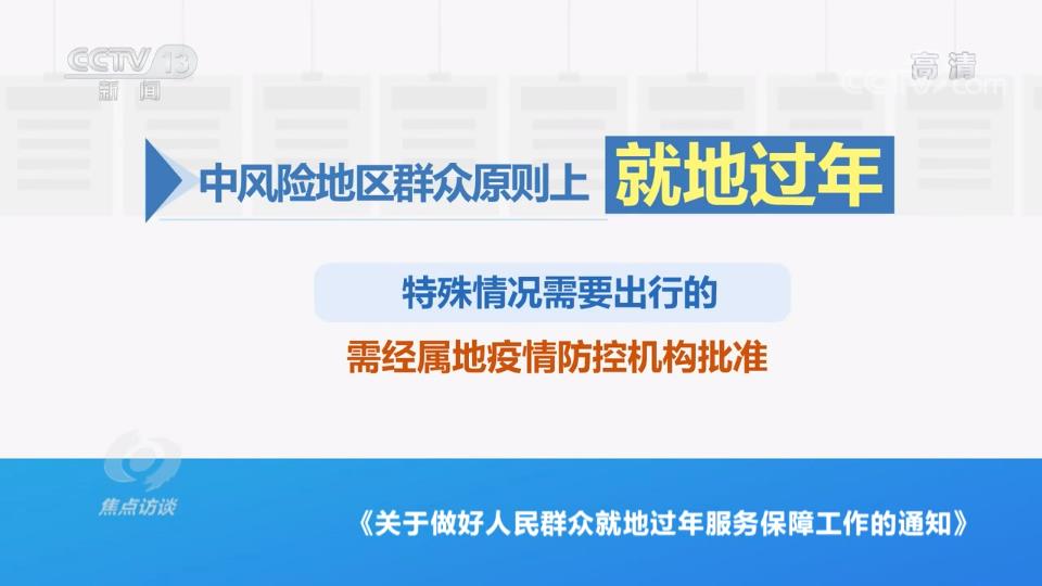 近日,中共中央辦公廳、國務(wù)院辦公廳印發(fā)了《關(guān)于做好人民群眾就地過年服務(wù)保障工作的通知》,明確了春節(jié)期間要合理有序引導(dǎo)群眾就地過年。就地過年政策是分級分類的:其中,疫情高風(fēng)險地區(qū)群眾均應(yīng)就地過年,把人員流動降到最低,防止因人員流動導(dǎo)致疫情傳播擴散。中風(fēng)險地區(qū)群眾原則上就地過年,特殊情況需要出行的,需經(jīng)屬地疫情防控機構(gòu)批準(zhǔn)。低風(fēng)險地區(qū)倡導(dǎo)群眾就地過年,非必要不出行。機關(guān)、事業(yè)單位和國有企業(yè)人員要帶頭就地過年,引導(dǎo)外地農(nóng)民工、尚未離校的師生就地過年,確需出行人員原則上不前往中高風(fēng)險地區(qū)。