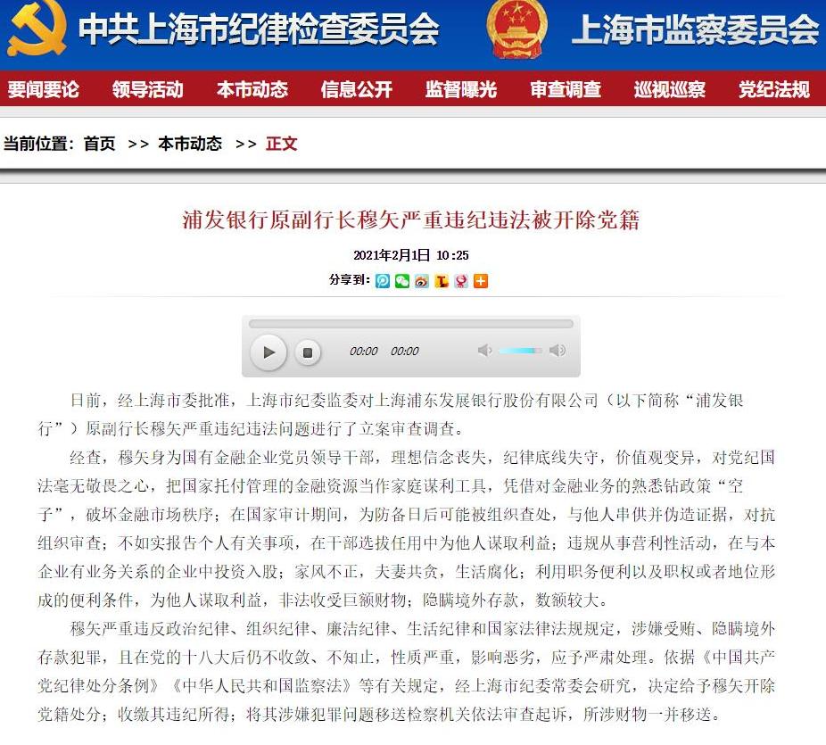 據(jù)上海市紀委監(jiān)委消息:日前,經上海市委批準,上海市紀委監(jiān)委對上海浦東發(fā)展銀行股份有限公司(以下簡稱“浦發(fā)銀行”)原副行長穆矢嚴重違紀違法問題進行了立案審查調查。