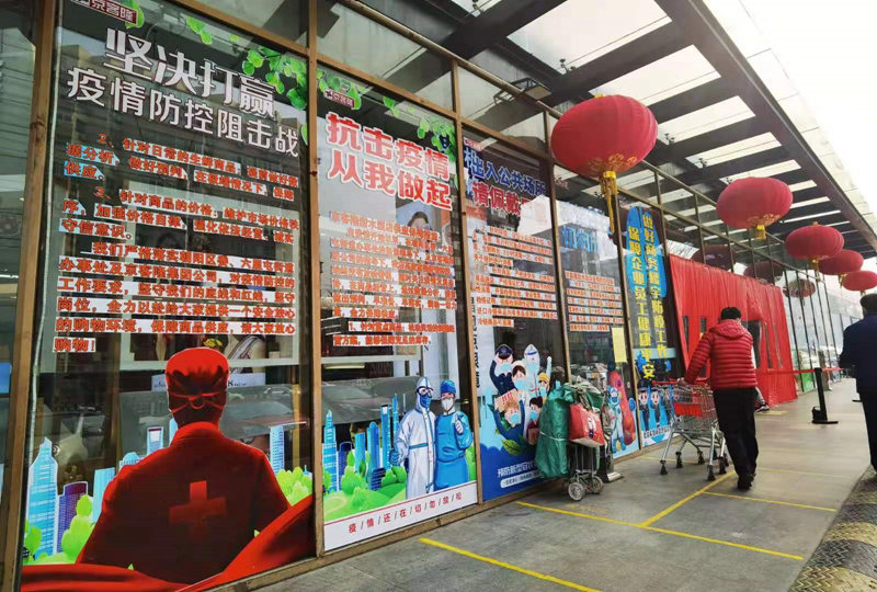 北京市朝陽區(qū)京客隆超市(甜水園店)的玻璃大門上,貼滿了“堅決打贏疫情防控阻擊戰(zhàn)”“抗擊疫情從我做起”“進(jìn)入公共場所請佩戴口罩”等醒目標(biāo)語及五彩繽紛的宣傳圖片,與玻璃門上方充滿節(jié)日喜慶的大紅燈籠相映成趣。超市嚴(yán)格按照防范規(guī)定,消費(fèi)者需要先掃描健康碼、測量體溫后,再有序進(jìn)入超市。