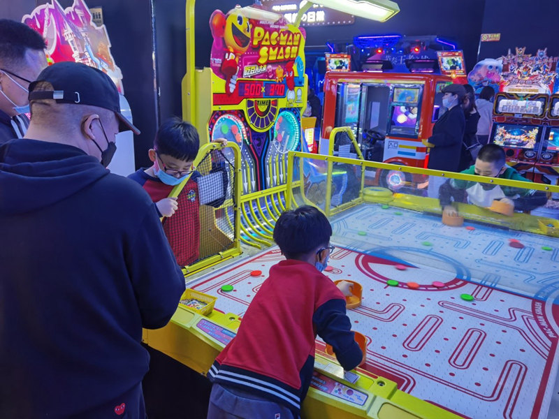 春節(jié)期間,在位于北京市朝陽區(qū)西大望路的某大型購物中心休閑娛樂區(qū),家長和孩子們均佩戴口罩,在家長的看護(hù)下,孩子們保持安全距離,玩桌面冰球不亦樂乎。