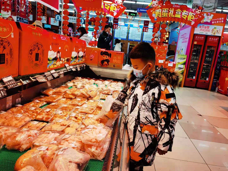 大年三十,超市內(nèi)充滿了節(jié)日的喜慶氛圍。一位小朋友手套塑料袋,正在學(xué)習(xí)如何在做好個人防護(hù)的情況下,安全購買冷鏈?zhǔn)称贰?/p>