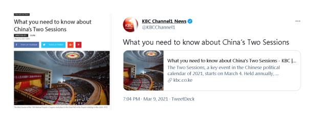△肯尼亞廣播公司KBC網(wǎng)站和新媒體端對于兩會基本情況的報道截圖