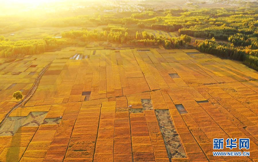 2020年10月18日在河北灤州市古城街道蔣莊村拍攝的稻田(無(wú)人機(jī)照片)。新華社記者 牟宇 攝