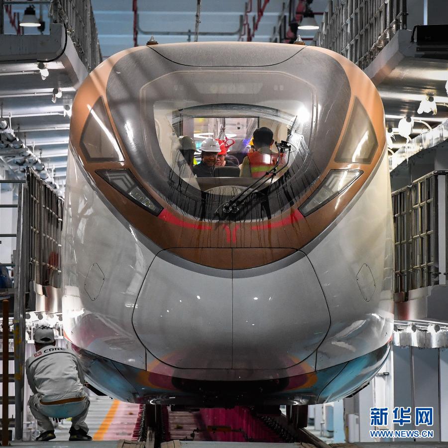 參加熱滑試驗(yàn)的技術(shù)人員對(duì)廣州地鐵18號(hào)線時(shí)速160公里電客車(chē)進(jìn)行發(fā)車(chē)前最后一次設(shè)備狀況查驗(yàn)(3月3日攝)。新華社記者 劉大偉 攝