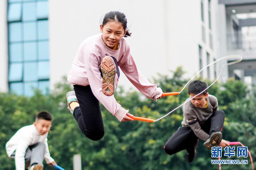 2020年12月9日,重慶市九龍坡區(qū)西彭鎮(zhèn)第一小學(xué)校跳繩隊(duì)隊(duì)員在進(jìn)行花樣跳繩訓(xùn)練。該校從1999年開(kāi)始引進(jìn)跳繩,開(kāi)展特色體育活動(dòng)。新華社記者 劉潺 攝
