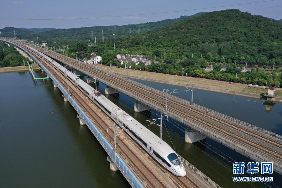 一列和諧號(hào)動(dòng)車(chē)組列車(chē)駛經(jīng)京滬高速鐵路南京段(無(wú)人機(jī)照片,2020年6月30日攝)。新華社發(fā)(方東旭 攝)