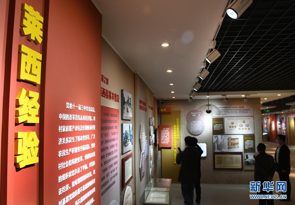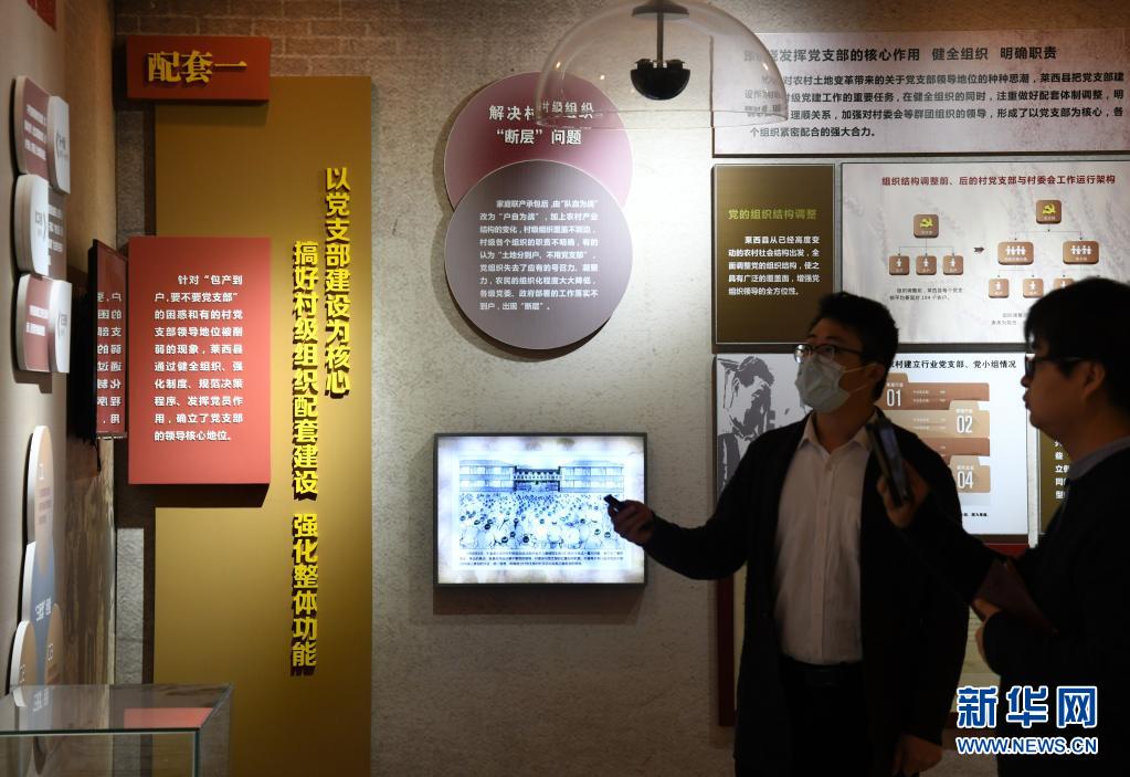 工作人員在“萊西會(huì)議專題展”上為觀眾講解村級(jí)組織建設(shè)“三配套”經(jīng)驗(yàn)(3月25日攝)。新華社記者 李紫恒 攝