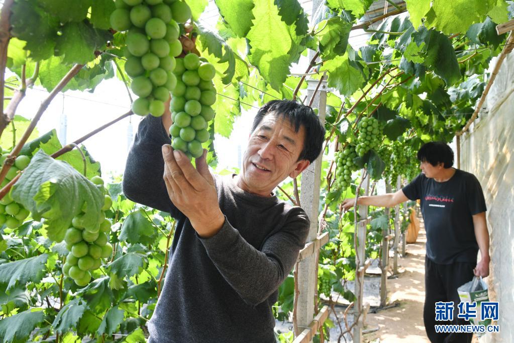 村民郭少坤在青島萊西市茂芝場高效農(nóng)業(yè)示范園內(nèi),查看即將上市的葡萄(3月25日攝)。新華社記者 李紫恒 攝