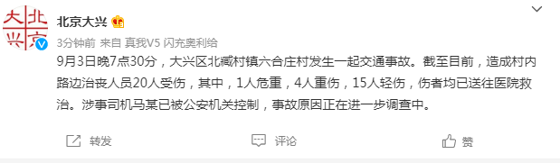 據(jù)“北京大興”微博消息,9月3日晚7點(diǎn)30分,大興區(qū)北臧村鎮(zhèn)六合莊村發(fā)生一起交通事故。截至目前,造成村內(nèi)路邊治喪人員20人受傷,其中,1人危重,4人重傷,15人輕傷,傷者均已送往醫(yī)院救治。涉事司機(jī)馬某已被公安機(jī)關(guān)控制,事故原因正在進(jìn)一步調(diào)查中。