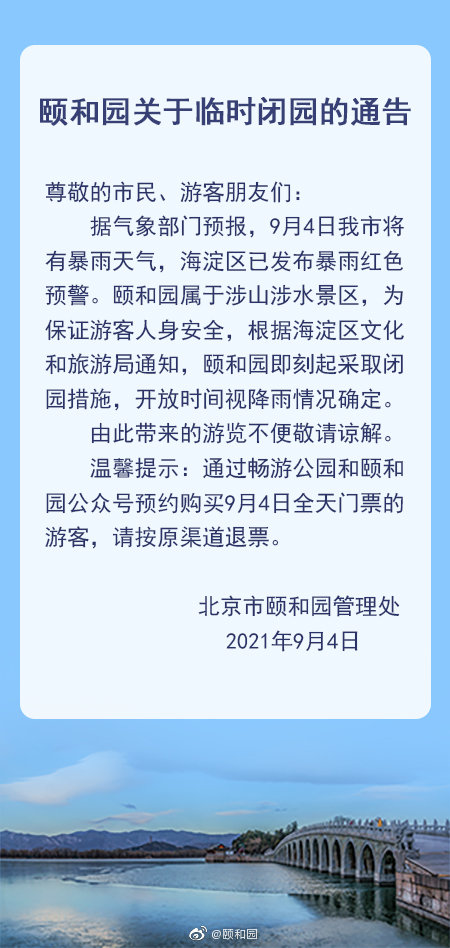 根據(jù)北京市氣象部門預(yù)報(bào),今日(4日)北京市將有暴雨天氣。頤和園、香山公園和北京植物園屬于涉山涉水景區(qū),為了保證游客人身安全,即刻起臨時(shí)關(guān)閉,開放時(shí)間將視雨晴而定。
