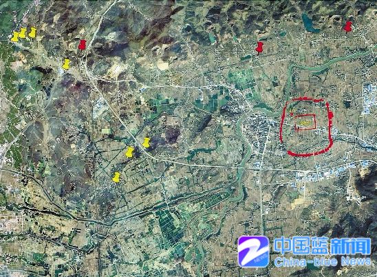 圖中的紅點(diǎn)是已經(jīng)發(fā)掘和測(cè)年的水壩 黃點(diǎn)是調(diào)查發(fā)現(xiàn)但沒(méi)有正式發(fā)掘的水壩 紅色回字是良渚古城