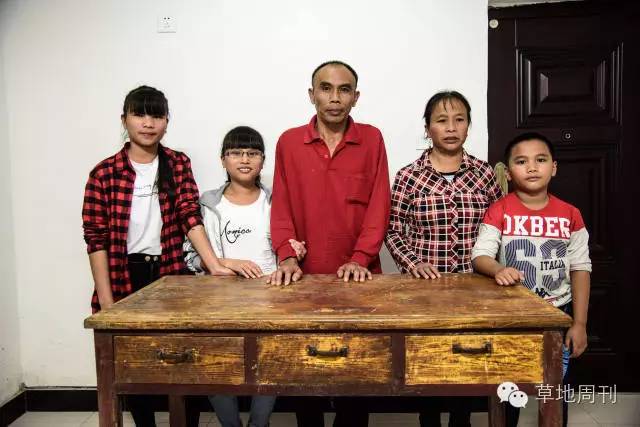 惠水縣明田安置小區(qū)安置房內(nèi),羅海麗(左二)全家人與從老家屋子里搬出的唯一一件物品——一張桌子合影。(9月10日攝)新華社記者 劉續(xù) 攝