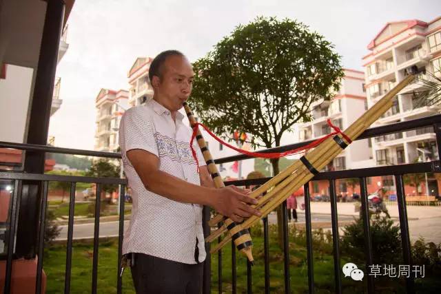 貴州省惠水縣明田安置小區(qū),梁王地正吹奏蘆笙。(9月12日攝)新華社記者 劉續(xù) 攝