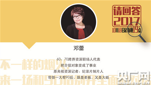 鄧?yán)伲?0、70跨界資深職場(chǎng)人代表,把介紹對(duì)象變成了事業(yè),原央視資深記者、紀(jì)錄片制片人,帶領(lǐng)一大幫90后,既是老板,又是大姐。