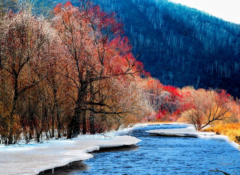 此時(shí)的阿爾山,藏著別處難尋的春日絕色。紅毛柳迎來最佳觀賞期,河畔枝頭緋紅似火,如丹霞落岸,與皚皚白雪、半融冰河相映成趣,艷紅襯素白,分外動(dòng)人。晨霧漫過河岸,紅柳輕舞搖曳,將早春的浪漫寫到極致。