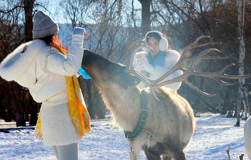 游客與馴鹿互動(dòng)(興安盟融媒體中心供圖)