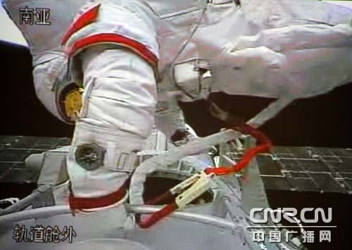 艙外航天員身上的安全掛鉤將航天員與神七飛船緊密相連。(中廣網(wǎng)記者南光 曹囡囡攝)