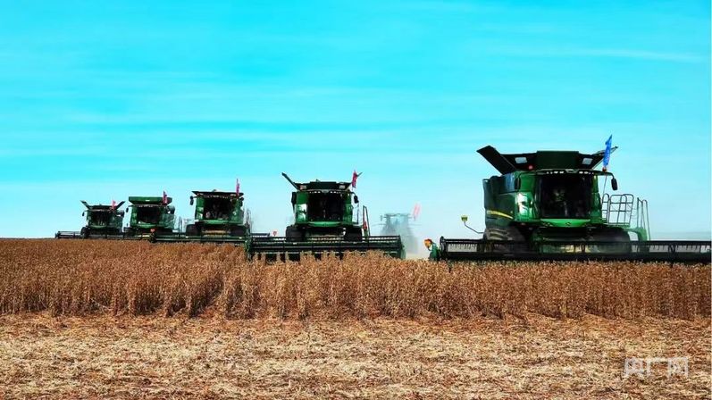 多臺現(xiàn)代化大馬力收割機在廣袤的大豆地里轟鳴作業(yè)(央廣網(wǎng)發(fā) 阿榮旗融媒體中心供圖)