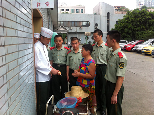 中廣網(wǎng)成都8月24日消息(記者隆敏 通訊員連軼 封金劍)去年以來(lái),武警成都支隊(duì)某中隊(duì)的官兵遇到一件怪事,一位騎三輪車(chē)的婦女每隔幾天就會(huì)放一袋蔬菜在中隊(duì)執(zhí)勤哨兵旁,然后匆匆離去。建軍節(jié)快到了,官兵們把苦苦尋找了一年多的“送菜人”接到營(yíng)區(qū),戰(zhàn)士們終于和這位神秘女子見(jiàn)了面。盛夏季節(jié),騎三輪車(chē)出行很熱,戰(zhàn)士們特意買(mǎi)了兩頂帶有風(fēng)扇的帽子送給這位最美“送菜人”,而她也把自己精心腌制的泡菜、腌蒜帶給戰(zhàn)士們,作為“八一”的禮物。