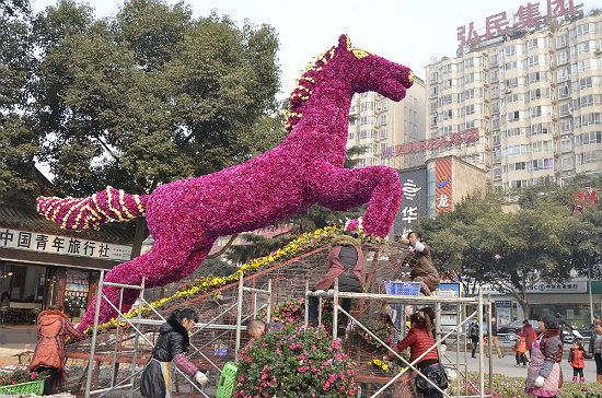 當(dāng)日上午10點(diǎn),記者在棠湖公園正門(mén)外看到,經(jīng)過(guò)園藝工人的巧手裝扮,一匹鮮花“編織”的駿馬活靈活現(xiàn)。據(jù)了解,依照設(shè)計(jì),駿馬由2萬(wàn)余朵康乃馨構(gòu)成,馬體絕大部分運(yùn)用了紫紅色康乃馨,頭部鬃毛及尾部則用黃色鮮花點(diǎn)綴著。